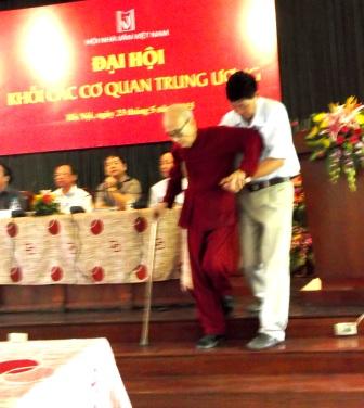 Cả hội trường chăm chú khi nhà văn GS 100 tuổi Vũ Khiêu được dẫn lên bục phát biểu. Ông nhắc nhà văn hãy luôn luôn đồng hành cùng nhân dân, hiện giờ Biển Đông họ đang âm mưu lấn chiếm, phải kiện họ. Nhà văn hãy quan tâm đến văn hóa Việt đó là sức sống của dân tộc. Ông kể một ngày ông chỉ ngủ 4 tiếng, làm việc không ngơi nghỉ, đang hoàn thành đọc 134 tập sách về Hà Nội và nhiều công trình khác. Ông khen Trần Đăng Khoa vừa có bài viết hay. Ăn vận một bộ quần áo màu huyết dụ, tay chống gậy vị GS gây một ấn tượng mạnh cho cử tọa. Một trăm tuổi mà giọng còn vang, hy vọng ông còn cất lên nhiều cung bậc vang vọng đất trời ! Tôi sung sướng đến lặng người khi vị GS luôn gọi các nhà văn là đồng chí. Bao nhiêu người ngồi kia còn kém xa tuổi cụ mà được cụ cho là đồng chí thì ai không rưng rưng...